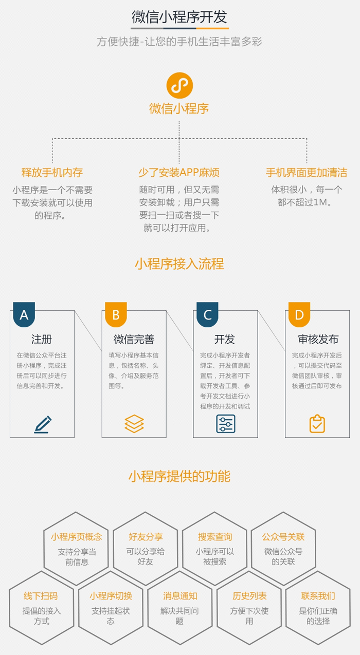 對于用戶而言,小程序不需要安裝,也不會給用戶主動發(fā)去提示消息,不占用 APP 那么大的手機內(nèi)存,只要有微信就能使用,隨用隨走,十分方便;