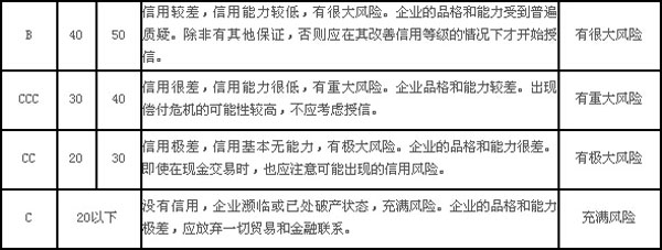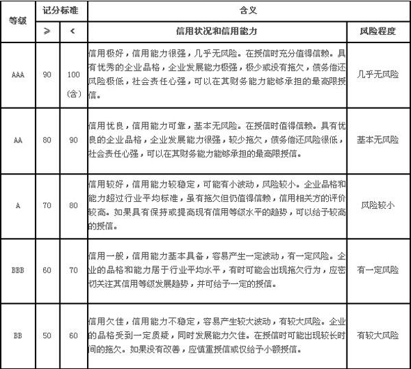 互聯(lián)網(wǎng)行業(yè)信用評(píng)價(jià)等級(jí)分為“三等九級(jí)”,即A、B、C三等,AAA、AA、A、BBB、BB、B、CCC、CC、C九級(jí),每10分區(qū)分為一個(gè)級(jí)別,如下表所示: