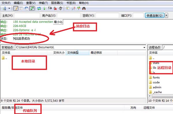 Filezilla界面分為四塊:上面是消息日志,顯示工具的工作狀態(tài);左側(cè)是本地目錄樹;右側(cè)是遠(yuǎn)程目錄;下方是隊列中的文件。