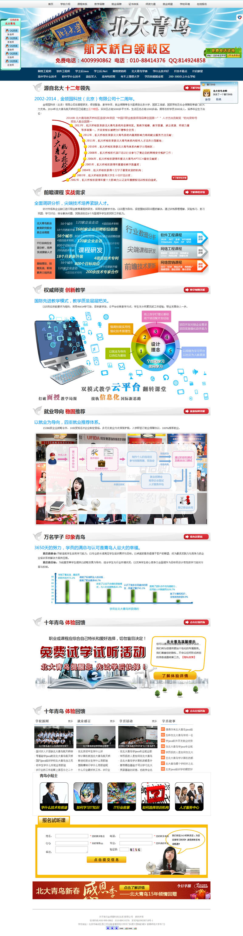 北大青鳥航天橋白領中心是北京設立五千平米實驗基地的校區(qū),總建筑面積近6000平方米,并為學員提供住宿。為了學員更能更快更好的適應企業(yè)的工作,我們建設了自己的網絡工廠,使學員在學習過程中,接觸并感受企業(yè)的工作模式,沒畢業(yè)就先有了工作經驗,使我們的學員畢業(yè)以后能夠更自信更專業(yè)更高薪的面對職場生涯。