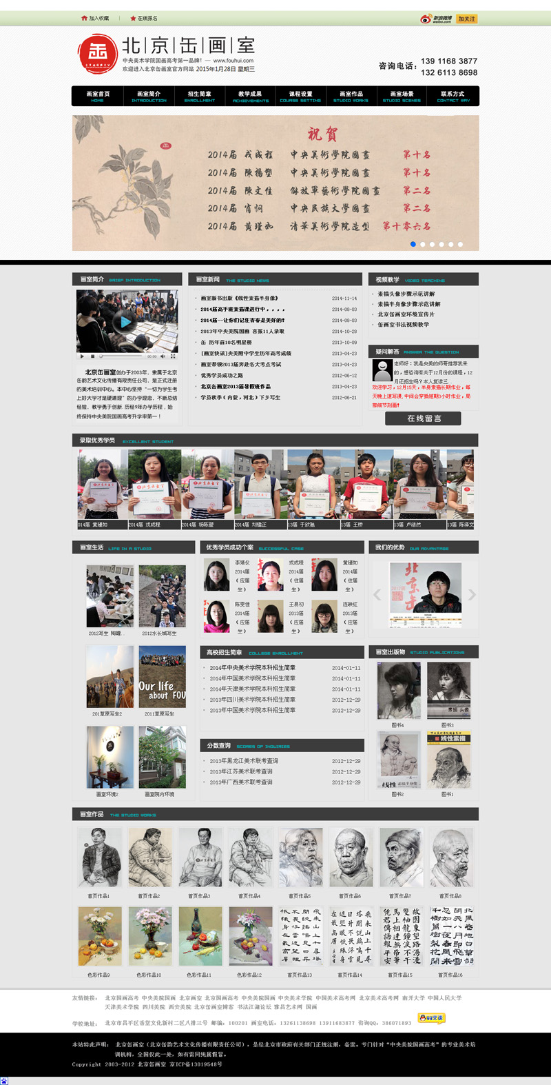 北京缶畫(huà)室創(chuàng)辦于2003年,隸屬于北京缶韻藝術(shù)文化傳播有限責(zé)任公司,是正式注冊(cè)的美術(shù)培訓(xùn)中心。本中心堅(jiān)持“一切為學(xué)生考上好大學(xué)才是硬道理”的辦學(xué)理念,不斷總結(jié)經(jīng)驗(yàn),教學(xué)勇于創(chuàng)新,歷經(jīng)9年辦學(xué)歷程,始終保持中央美院國(guó)畫(huà)高考升學(xué)率第一!